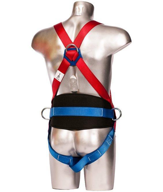 Imbracatura anticaduta con cintura di posizionamento. Ergonomica, con anello dorsale. Cintura traspirante sagomata con due anelli latrali e fibbie facili da regolare. Cinghie in poliestere e nylon. Le regolazioni per vita, petto e gambe la rendono confortevole. Taglia unica regolabile. Certificazioni: EN 358 – EN 361