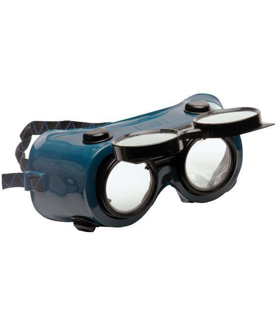 Occhiale a mascherina bilente per operazioni di ossitaglio e saldo-brasatura. Montatura realizzata in materiale anallergico, fascia elastica in tessuto, lenti in policarbonato, lenti esterne ribaltabili di 90°, valvola di areazione indiretta. Colore montatura:blu. Lenti: verde gradazione 5. Certificazioni: EN 166 1 F – EN 175 F