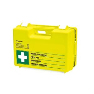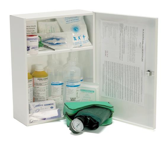 Armadietto in metallo verniciato con polvere epossidica, 1 ripiano, 2 vani, con serratura con chiave. Contenuto conforme al D.Lgs. n. 81/2008 – All. 1 D.M. 388/2003