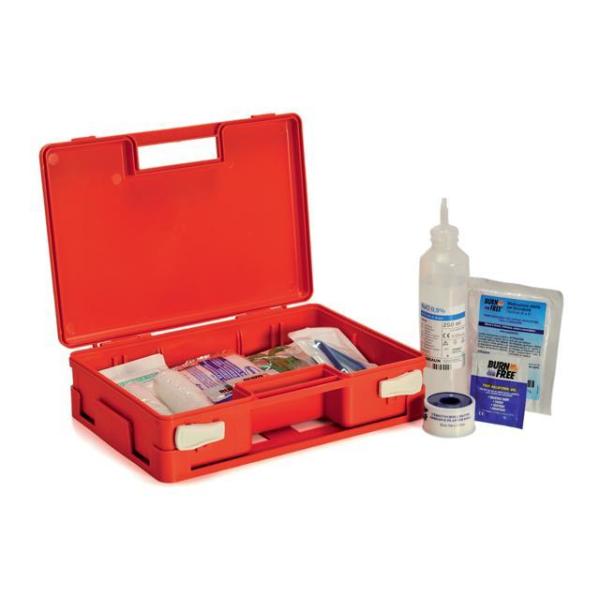 Valigetta in polipropilene, munita di divisori interni per una migliore disposizione degli articoli presenti al suo interno. Chiusura tramite due clips. Ideale per un primo soccorso per ustioni di piccola entità.